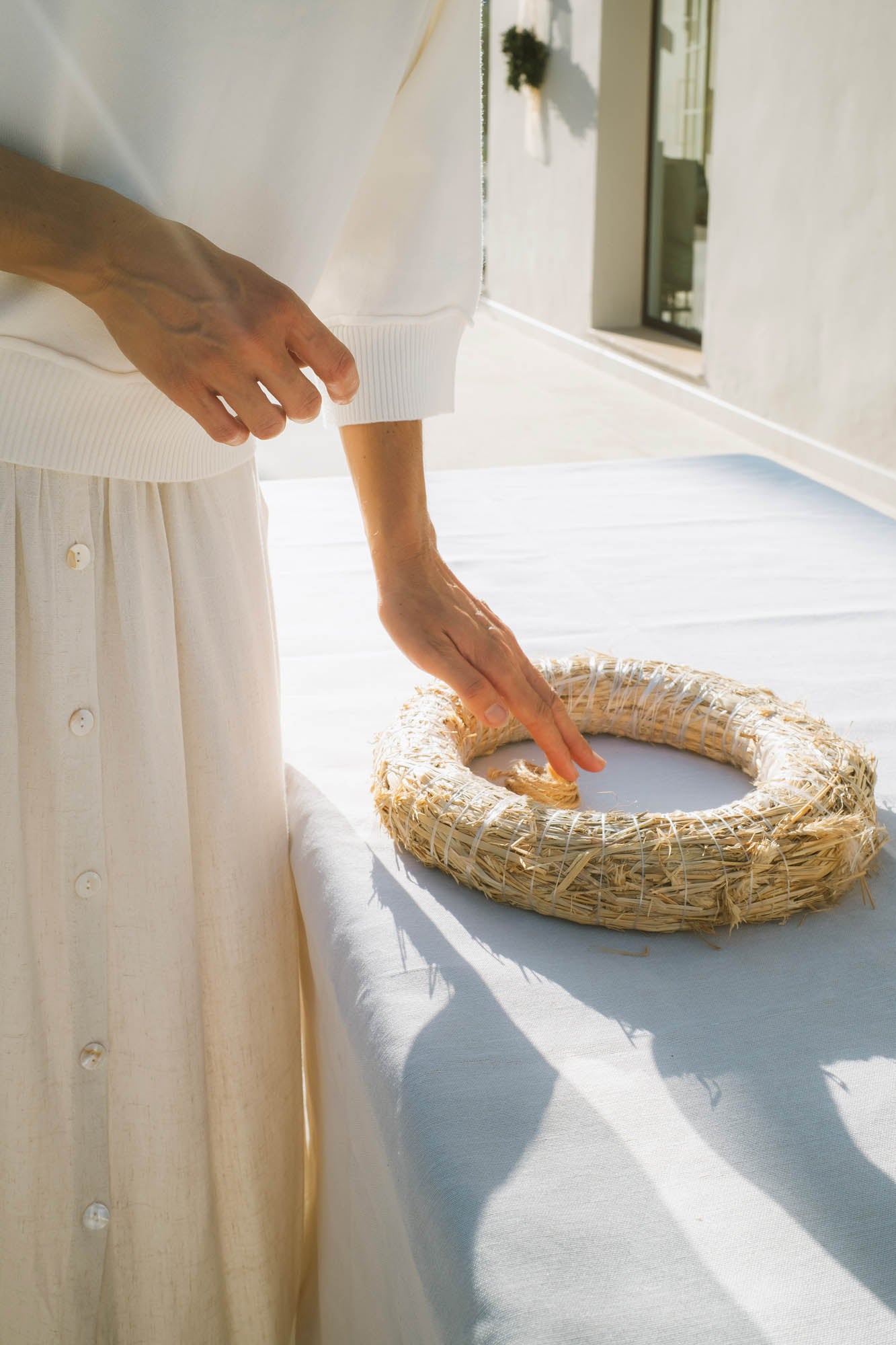 - A crear una corona con base de paja natural decorada con vegetación fresca que se seca maravillosamente en unos pocos días.